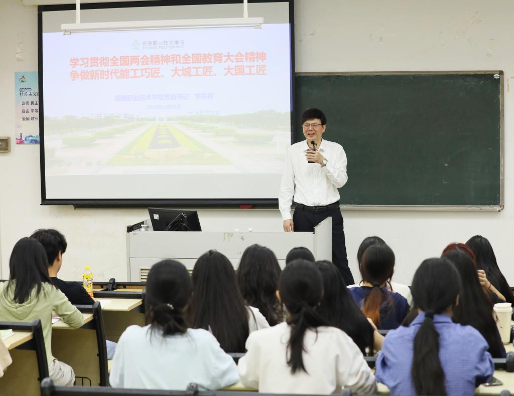 3月28日上午,学校党委书记李先祥在教学楼8栋305教室为2024级工业设计2班、2024级数字媒体1班学生上2025年春季学期“思政第一课”。他以“学习贯彻全国两会精神和全国教育大会精神,争做新时代的能工巧匠、大城工匠、大国工匠”为主题,寄语同学们把习近平总书记的殷殷嘱托牢记于心、践之于行,努力学习,树立自信,勇于担当,在推进强国建设、民族复兴伟业中放飞自己的青春梦想。