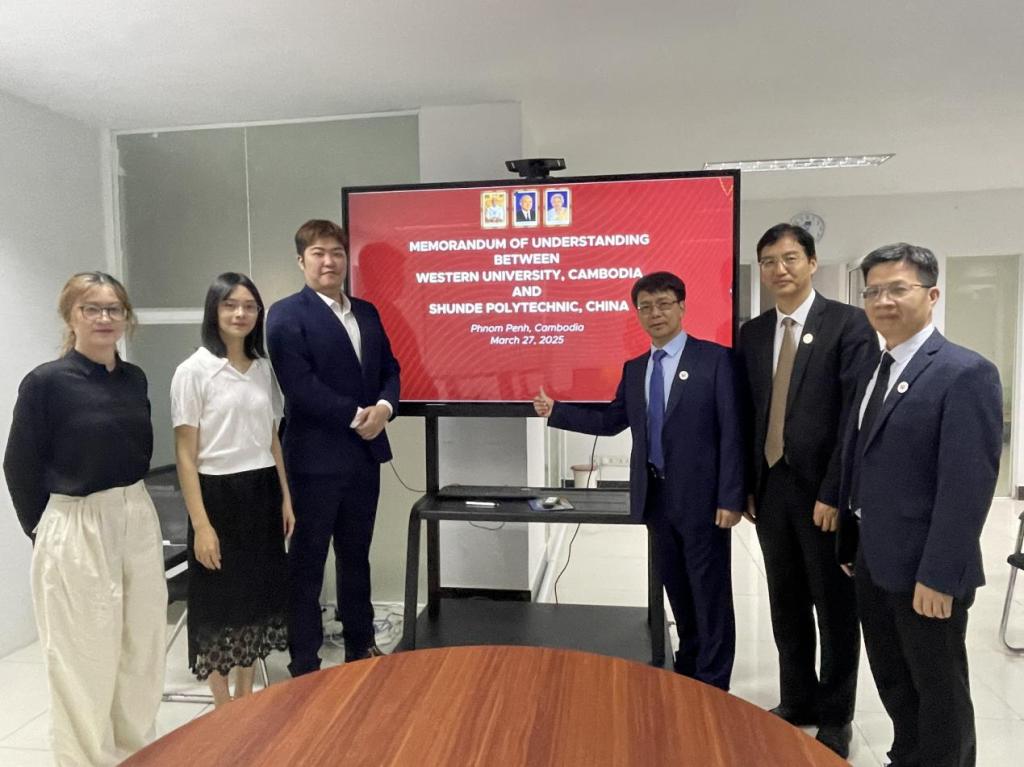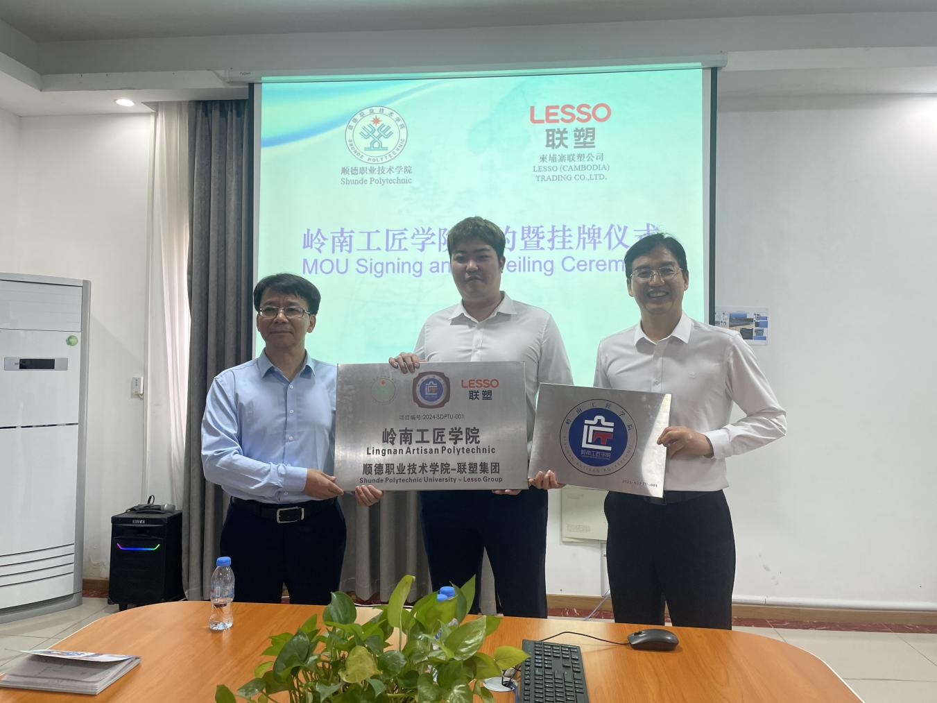3月27日,在顺德区委统战部、顺德侨联支持下,必赢官网“岭南工匠学院”柬埔寨基地在联塑集团(柬埔寨)科技实业有限公司签约挂牌。学校党委委员、副校长杨小东,柬埔寨西部大学校长Kieng Rotona、联塑集团柬埔寨科技有限公司总经理吴子杨参加相关活动。