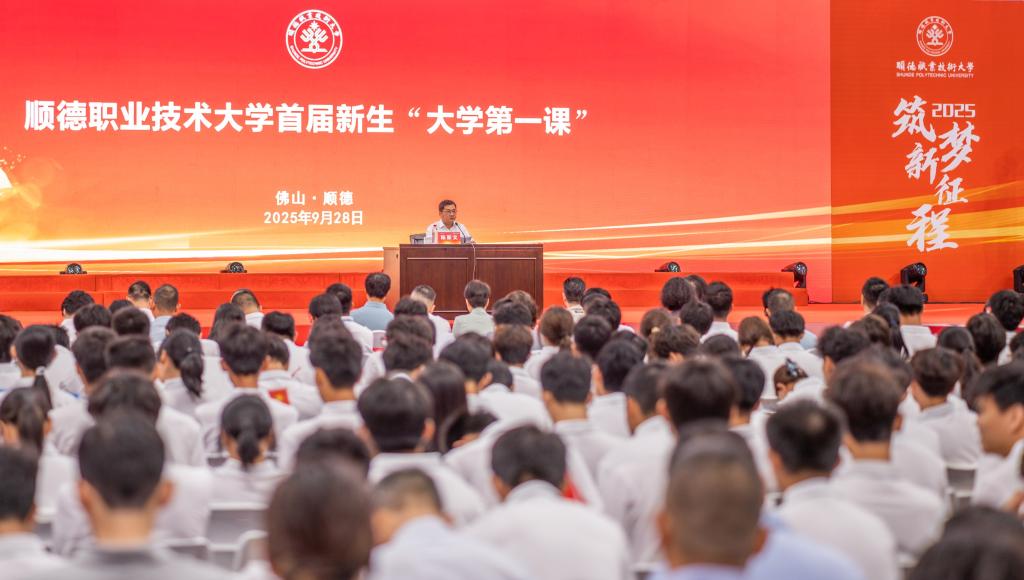 9月28日上午,顺德职业技术大学首届新生开学典礼暨“大学第一课”在德胜体育中心体育馆举行,佛山市委常委、顺德区委书记陈新文围绕深入学习贯彻习近平总书记关于教育的重要论述和全国教育大会精神,以“扎根沃土,匠心筑梦,在时代浪潮中谱写青春华章”为主题,为全体新生讲授“大学第一课”。