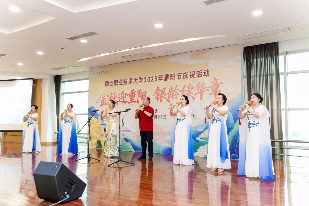 活动在古筝弹奏曲《向美好,盼岁长》中开启。退休教师自发组织的兰心舞社表演了长扇舞《唱支山歌给党听》。在教工葫芦丝队演奏的《让我轻轻地告诉你》《竹林恋》等乐曲声中,大家共同享受着重阳节的温馨时光。