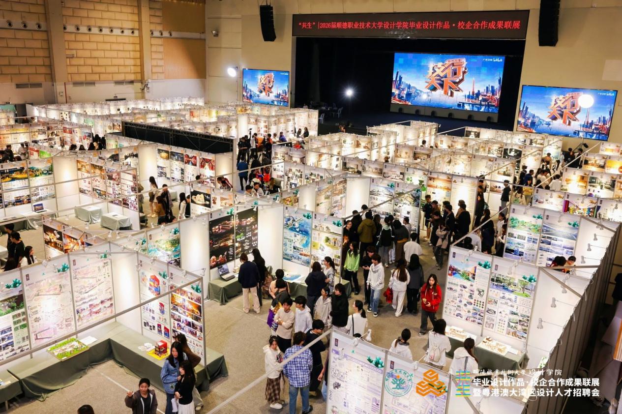 12月19日,以“共生”为主题的顺德职业技术大学设计学院2026届毕业设计作品·校企合作成果联展暨粤港澳大湾区设计人才招聘会在梁銶琚堂举行。其中,成果展汇聚设计学院8个专业、近900名2026届毕业生的优秀毕业设计作品;招聘会吸引118家企业现场招聘、数百家企业线上“云招聘”。线上线下观展师生及行业企业代表超10万人次,共同构建设计与产业、传统与创新、学校与社会的“共生”生态。