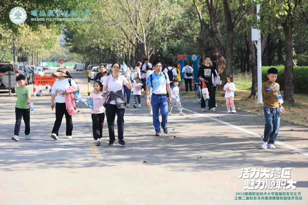 同时,本届校友文化节的亲子徒步活动同步进行。校友家庭沿着全程约3公里的路线,沿途打卡碧桂园湖、智园、玫瑰园、智慧门、美的大道、日景、墨子像、图书馆、梁銶琚堂等校园代表性景观。孩子们在前方雀跃探索,父母们相伴而行,大家在熟悉的校园风景中重温求学记忆、共享温馨时光,并频频用手机、相机记录下这美好难忘的时刻。