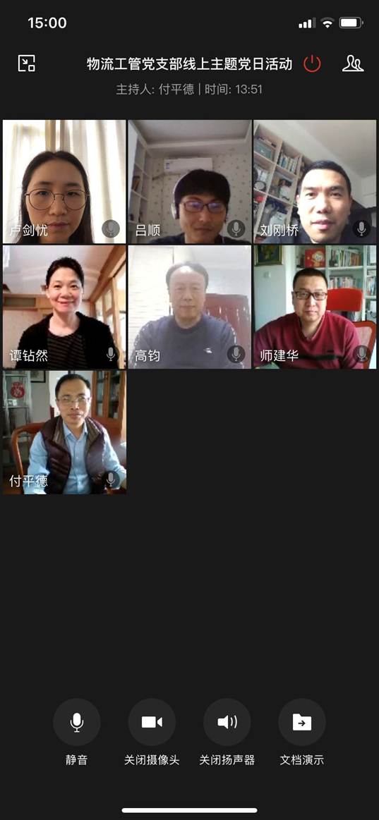 3月18日下午,商学院物流工管专业党支部开展了“疫情防控作表率,践行初心担使命” 线上主题党日活动。活动主要分为四个阶段:首先组织委员卢剑忧同志带领支部全体党员重温入党誓词,重温入党誓词让支部每位党员更加坚定自己的信念并努力实践;其次支部全体党员在线观看了新型冠状病毒预防须知的科普动画片,对如何做好预防有了更为深刻认识;接下来支部党员一起分享了“钟南山战疫全记录”和“李兰娟:忘我工作,每天只睡三小时”的先进事迹,并结合党中央教育部提出了“停课不停学”的号召与要求,纷纷介绍了各自疫情期间的工作情况,尤其是师建华同志分享了开学以来的在线授课心得,为其他党员同志提供了宝贵经验;最后全体党员在高钧院长和支部书记付平德同志的带领下一起进行了“我是党员我带头”的线上宣誓活动。