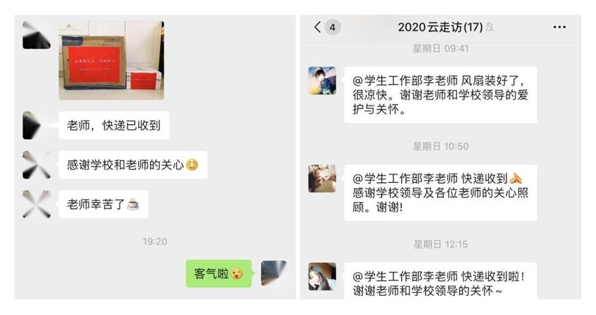 5月22和25日的下午,“云走访”每到一户家庭,家里的家长和孩子们都迫切的与“走访小组”的老师们亲切的攀谈。老师们详细介绍了孩子们在学校的表现、党和学校资助政策和资金到位情况,和询问家庭各方面近期是否受新冠疫情影响和其他实际困难,了解孩子们抗疫期间在家学习和生活的动态,也说明了全校师生携手抗疫的决心、措施和现状,鼓励全家人注重身体和心理健康,学校将作为家庭的后盾,尽全力为学生学习、就业和发展搭建平台。