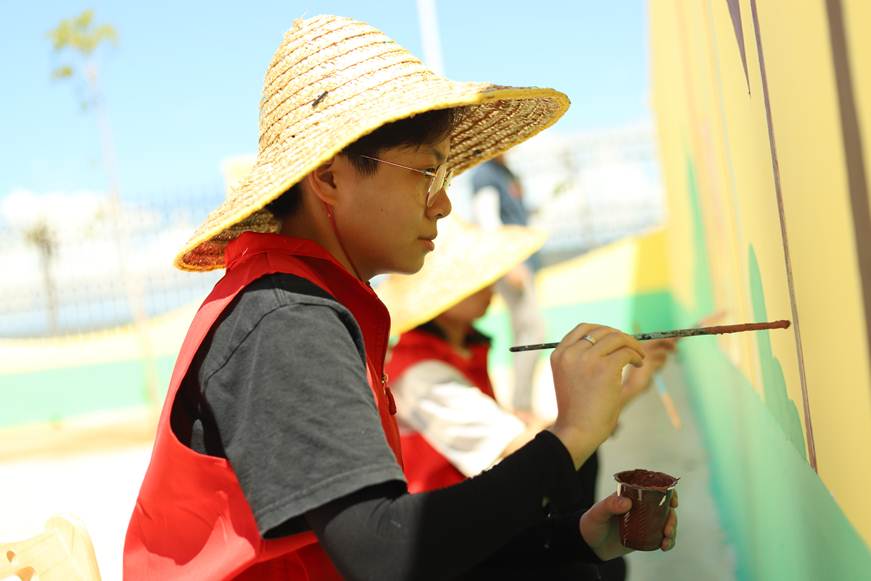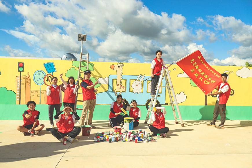 为推动农村精神文明建设,丰富乡村文化,实践队在雷州市新家村开展了墙绘工作。夏天的湛江格外炎热,气温高达40度,队员们每天早起晚归,顶着高温,一笔一划勾勒着线条,常常才画了几分钟就汗流浃背。每天的墙绘工作结束时,队员们的脸上、衣服上、鞋上都沾染了五颜六色的油彩,皮肤被晒得通红,但是他们都没有一丝的抱怨。