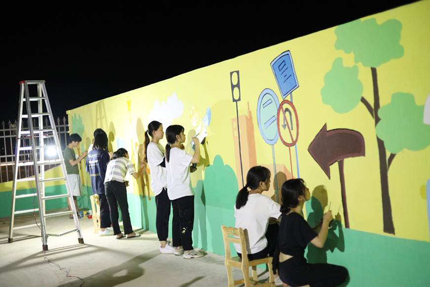 经过了五天的辛勤劳作,队员们共绘制了10余幅作品,绘图总面积达500多平方米。原本陈旧平淡的墙面经过队员们的精心设计和潜心创作变得生机勃勃。墙绘不仅为新家村的校园文化建设增添了绚丽的一笔,更重要的是以艺术的形式勉励乡村孩子们要懂得爱国、爱家、爱学习。