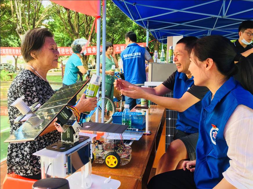技术咨询义工队由副院长肖文平带领,分爱车养护咨询、绿色能源光伏发电咨询、常用家电节能维护保养咨询三个小组,在苏岗社区篮球场以摆摊咨询、派发传单等形式,给社区群众提供职业教育宣传、“爱车养护”咨询、疫情期间的市内空气质量(空调维护)咨询、汽车内空气质量检测、空调清洁养护上门服务等内容。