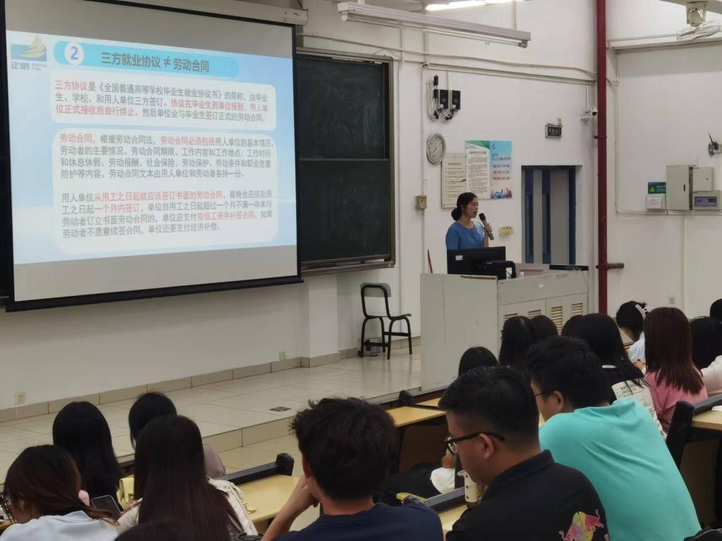 “大学生就业权益保障与法律风险防范”主题讲座由广东正帆律师事务所律师包红先主讲。包红先针对大学生就业法律知识匮乏、维权意识淡薄、社会经验不足,容易被侵犯权益的等问题,结合真实案例讲解就业过程中所涉的法律法规,指导大学生们识别求职就业中常见的合同陷阱、试用期陷阱、信息陷阱、传销陷阱、押金陷阱等,同时分享了创业过程中的法律风险及预防方法,提高同学们的法律意识。包红先表示,毕业生除了应当掌握专业技能,还要注意提高法律素养;步入社会后,要意识到诚信的重要性,明白法律保护的是包括自己在内的自然人、法人和其他社会组织等所有社会活动参与主体的合法权益,决不可心怀侥幸。