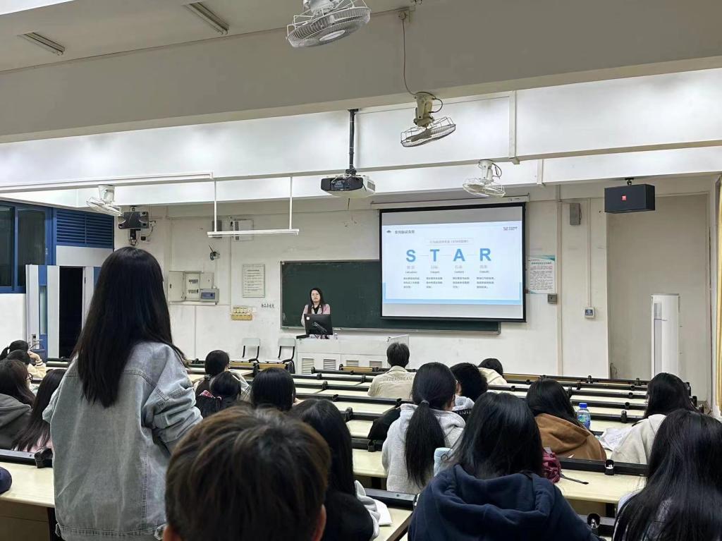 “面试礼仪”主题讲座由广西东呈酒店集团人力资源总监何璐主讲。她强调面试礼仪不仅可以展现一个人的教养、风度、气质和魅力,还能体现一个人对社会的认知水平,体现个人的学识、修养和价值。何璐从仪容仪表、服装配饰、语言表达、行为举止四个方面向同学们分享需要注意的面试礼仪,从入场、自我介绍讲到出门离场,向同学示范得体的面试礼仪。