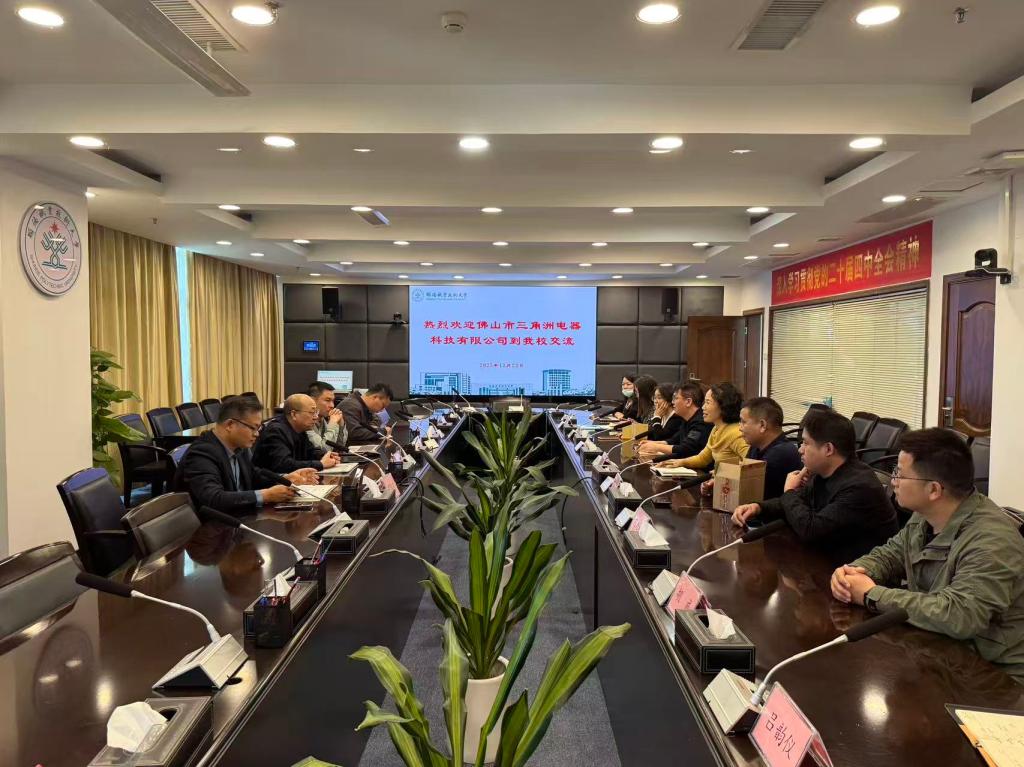 12月23日下午,三角洲电器科技有限公司财务长游德蕴、总经理邓文武一行六人到必赢官网交流。学校科技处处长张良桥,轻化与材料学院院长陈燕舞,能源与汽车工程学院胡正博士、何钦波博士,设计学院王璐老师及科技处相关人员陪同交流。