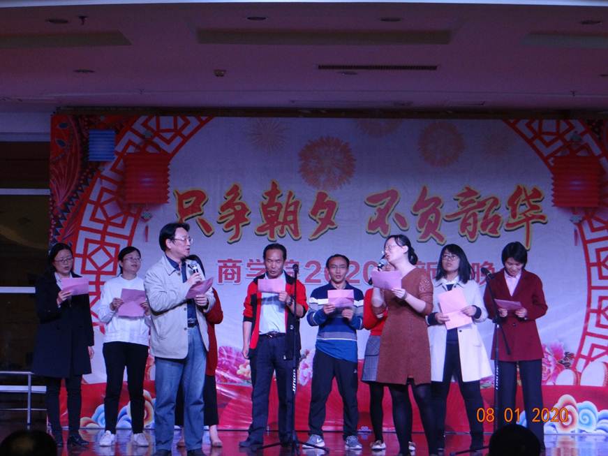 2020年1月8日晚上,主题为“只争朝夕,不负韶华”的商学院2020年新年晚会于学校教工之家顺利举行。商学院领导、全体教职工及家属逾80人参加了本次活动。