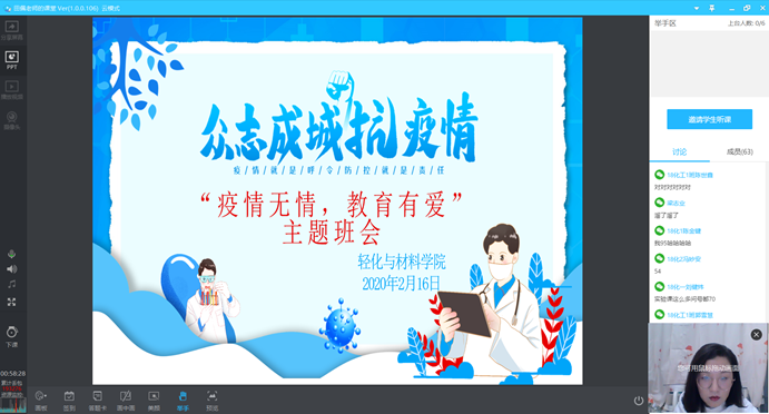习近平总书记指出,“疫情防控不只是医药卫生问题,而是全方位的工作,各项工作都要为打赢疫情防控阻击战提供支持”。轻化与材料学院按照上级安排部署,深入贯彻落实疫情防控工作精神,以坚持思想引领,强化责任担当,牢记育人使命为目标,于2月14-16日期间陆续组织全体学生召开了“疫情无情,教育有爱”线上主题班会,全体班主任在线主持会议。