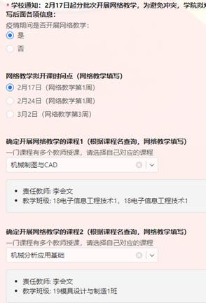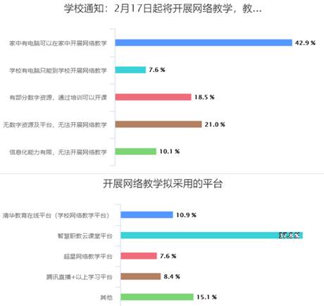 充分利用金数据调查问卷丰富的表单关联查询功能,自2月9日起,通过教师问卷确定老师网络教学开课课程、知晓开课班级,通过学生问卷连续10天通知网络教学开课时间,同时调查学生网络教学现有条件,发现问题,协助解决。